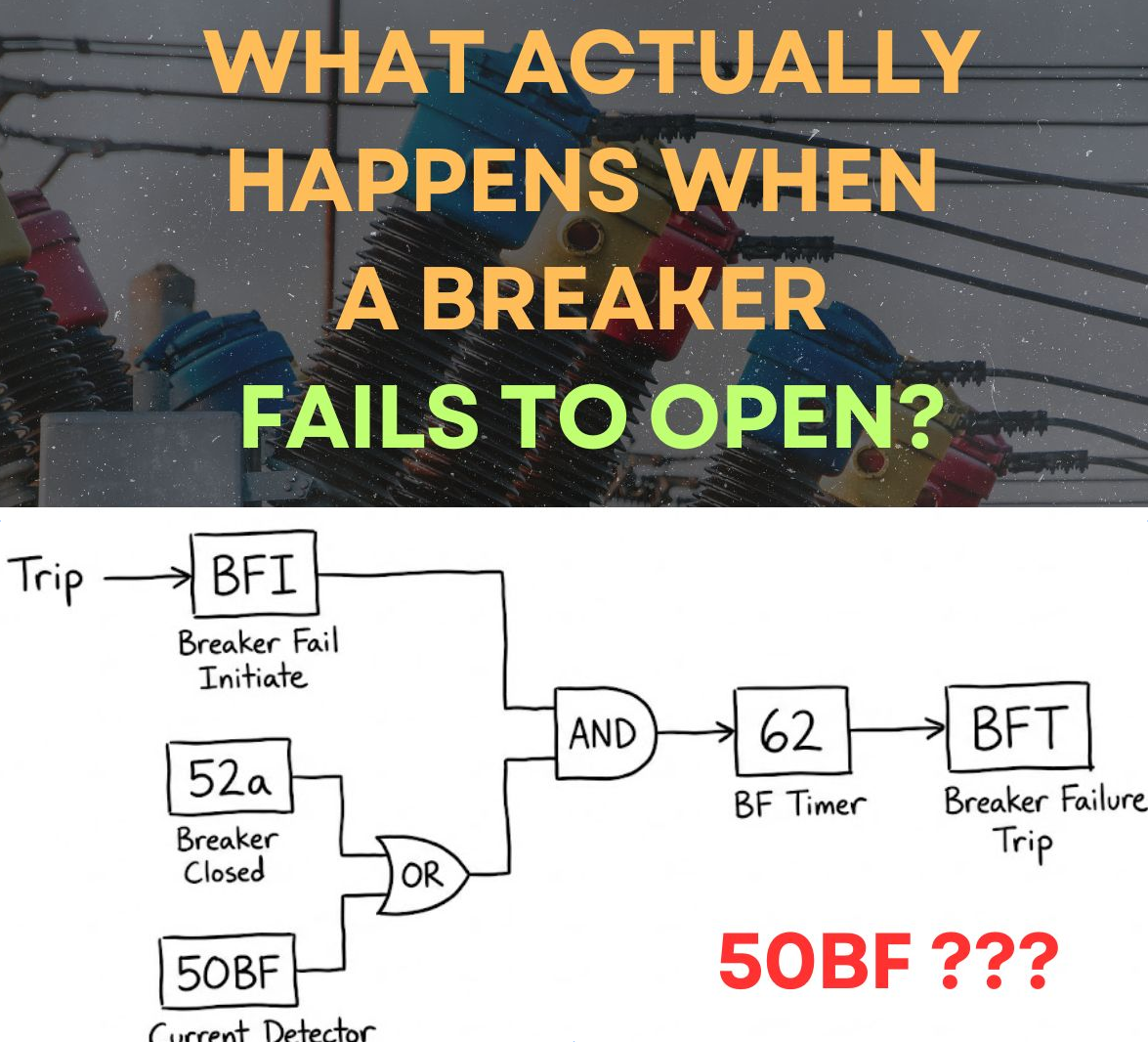 Breaker Failure Protection (50BF) trips adjacent breakers if the primary breaker fails to open after a fault, using trip initiation, auxiliary contact status, and residual current detection.